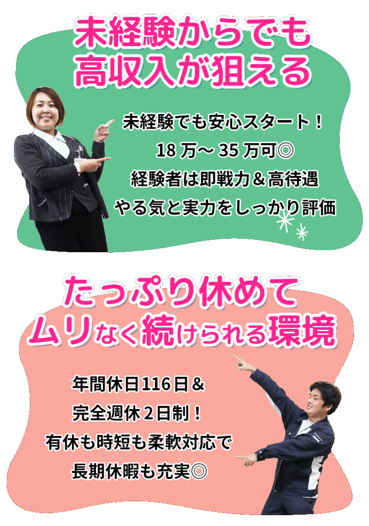 180,000円〜350,000円 男性/年齢の10~15倍(年収) 女性/年齢の10~12倍(年収) の給与をほぼ実現しています!